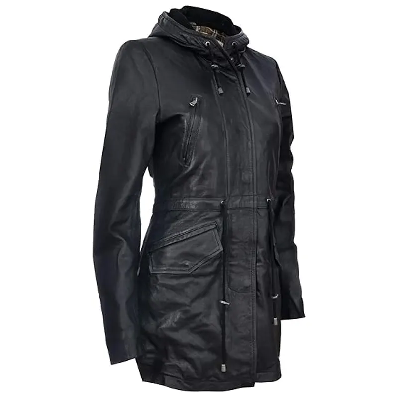 Elevate your winter style with this women’s Black Parka Detachable Hood Trench Coat. Crafted from Real Leather, this trench offers a stylish, versatile black leather coat perfect for cold weather. Featuring a detachable hood, this long black leather parka trench coat for women blends classic design with modern functionality. Shop this essential real leather quilted hooded overcoat for a warm and sophisticated look.